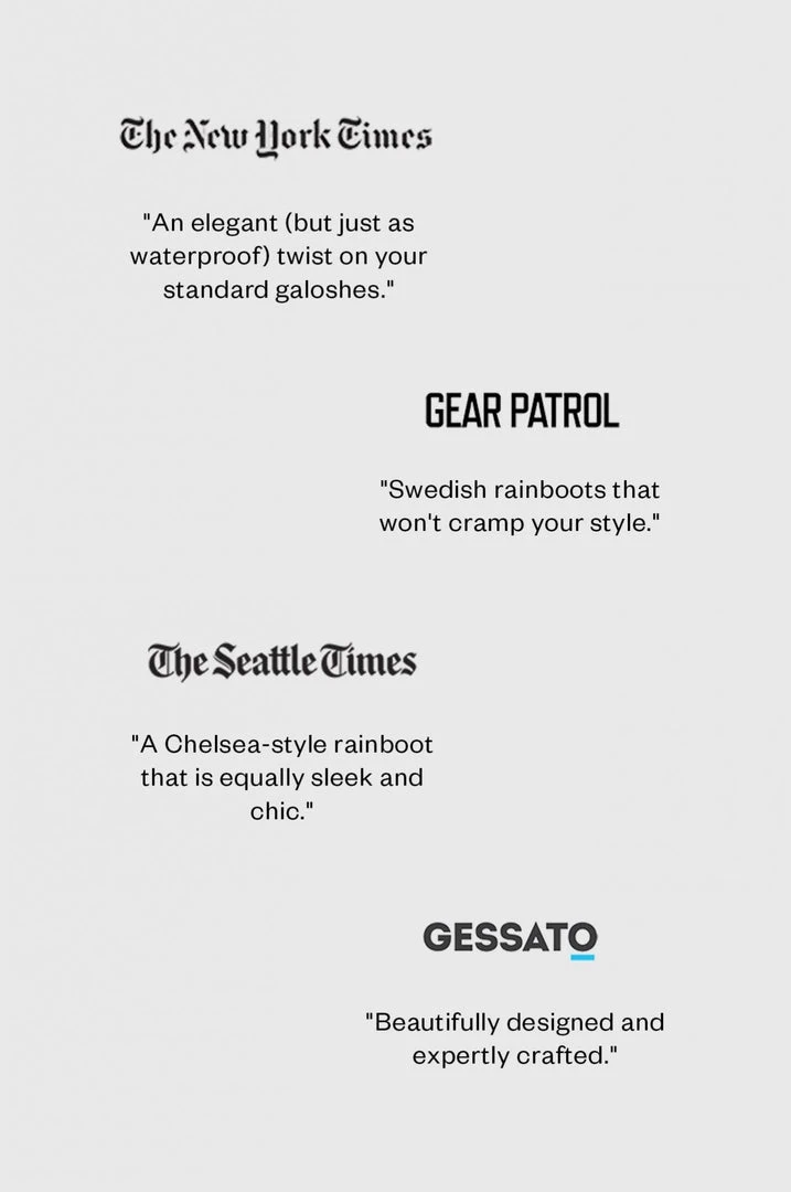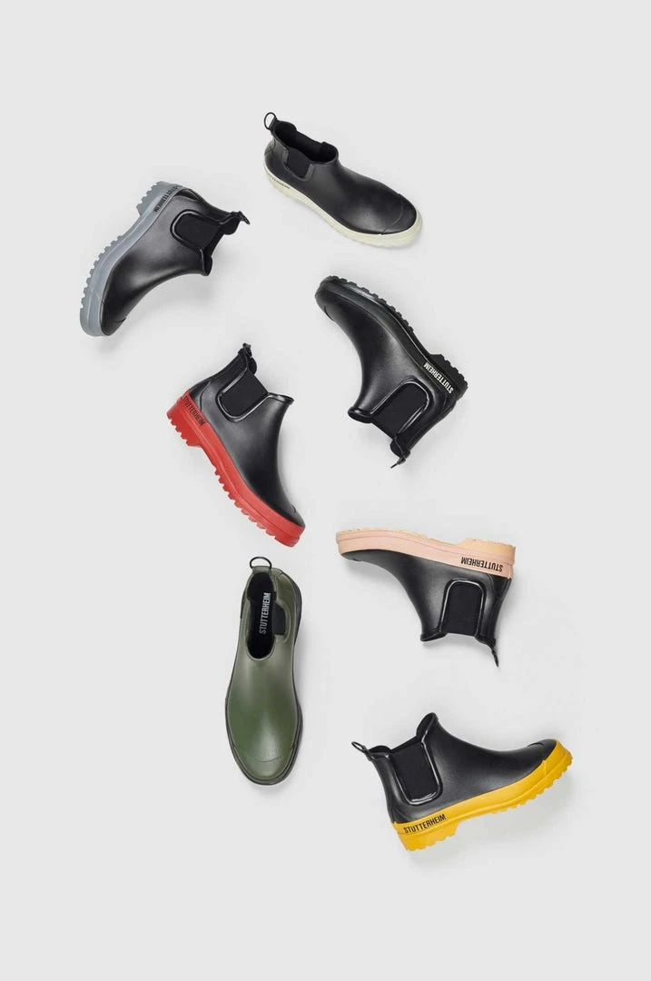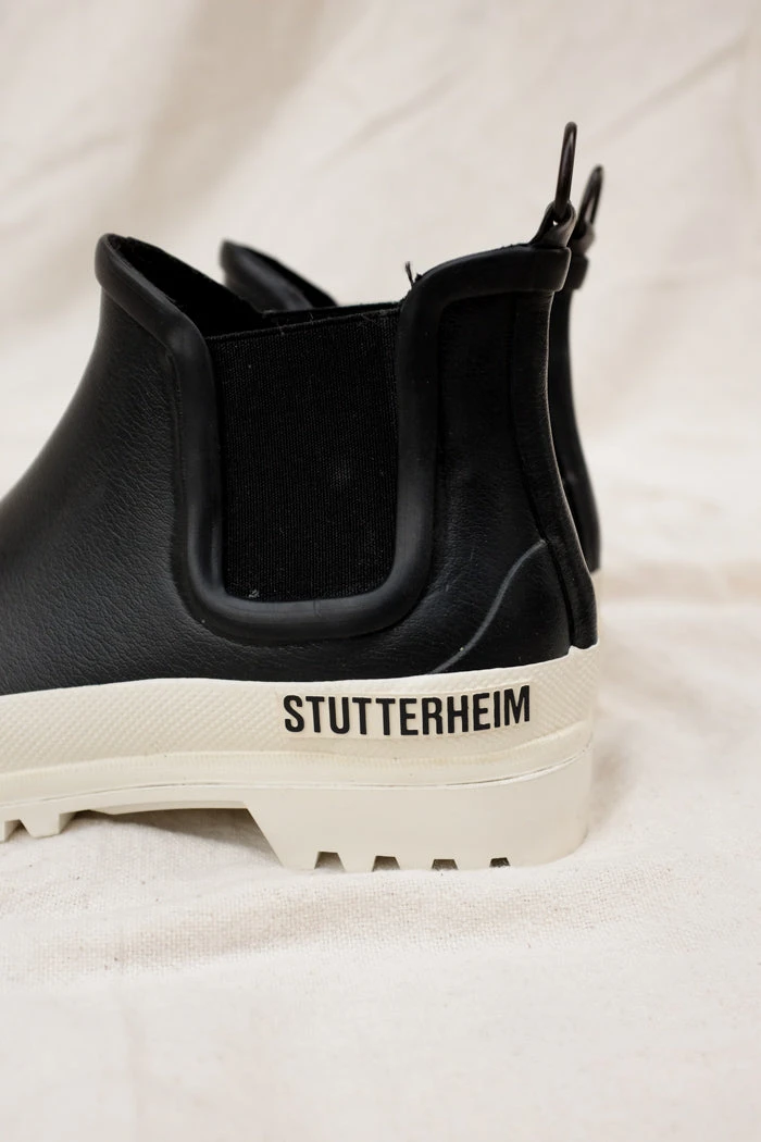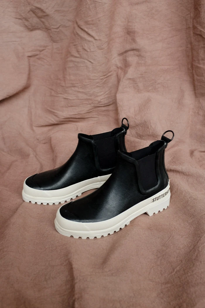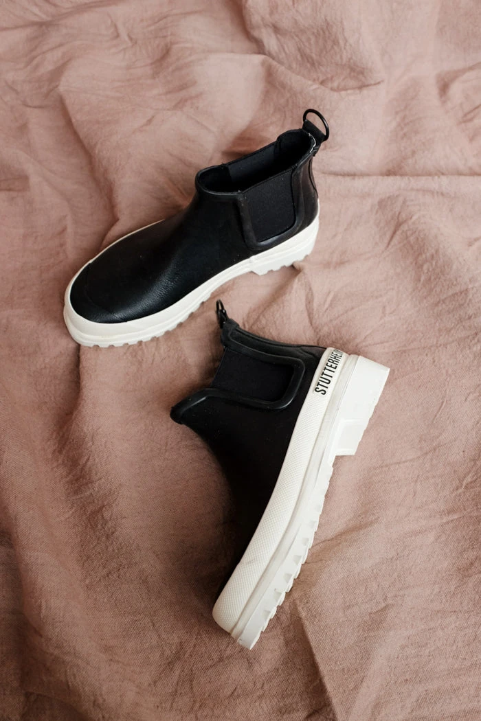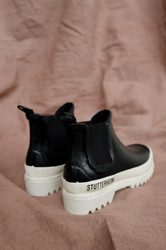 Stutterheim Chelsea rain walker rain boots in black with contrasting ivory soles. These boots are waterproof. soft and flexible, conforming to the wearer’s feet over time.