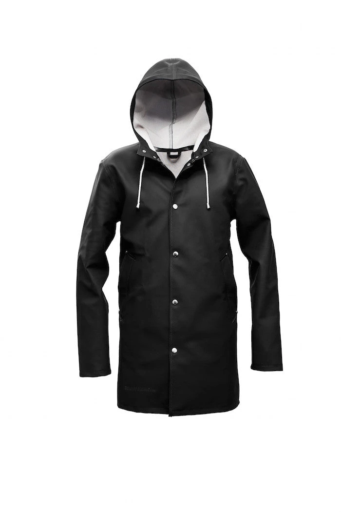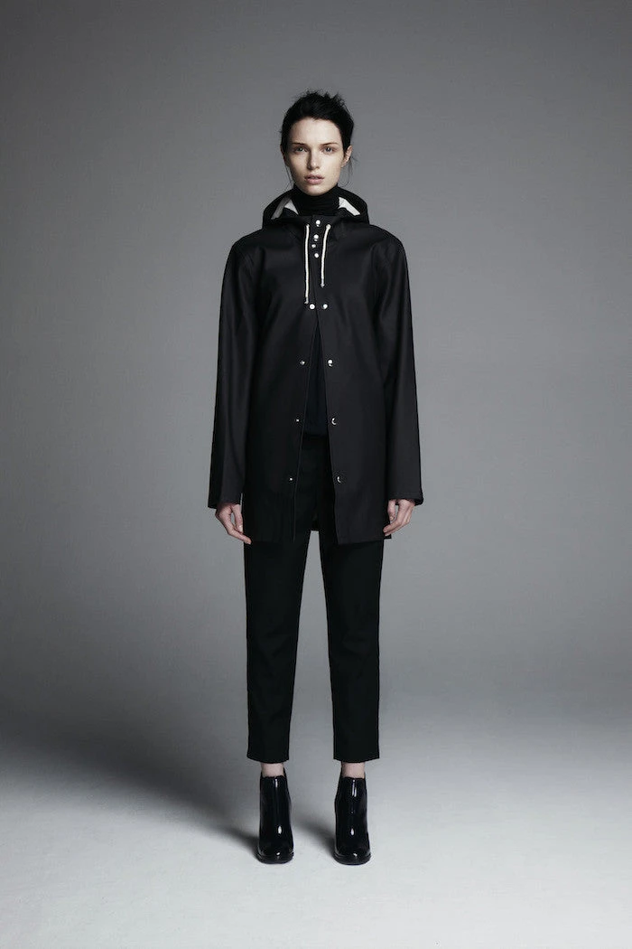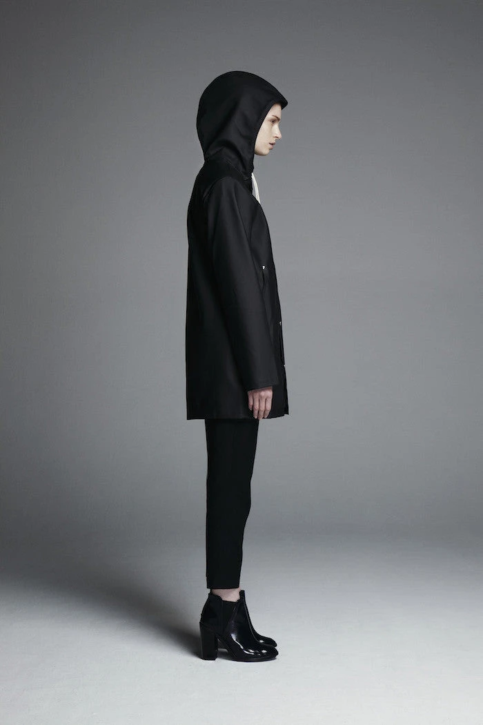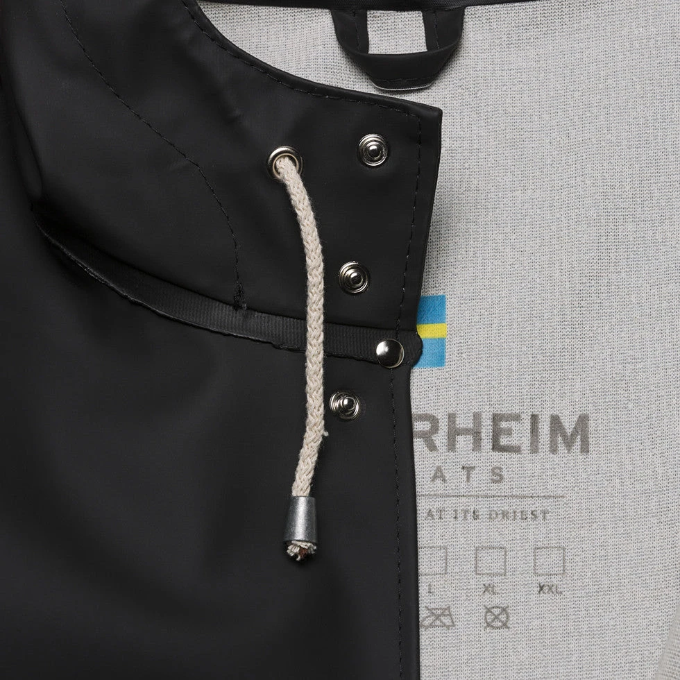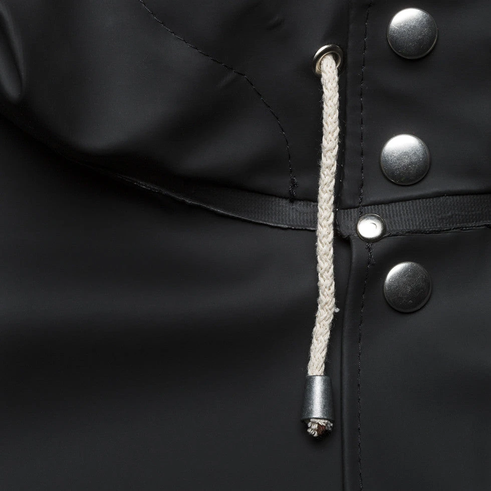 STUTTERHEIM Stockholm rain jacket in Black has snap closure, drawstrings, and exemplifies both versatility and durability in its updated design. Using the finest craftsmanship materials and details, the Stockholm coat has undergone sever testing in horrible conditions both at sea and in the city. Each coat is individually quality-controlled and handmade by a skilled seamstress. See other colors in Stockholm style here, or check out the A-line Mosebacke style here.