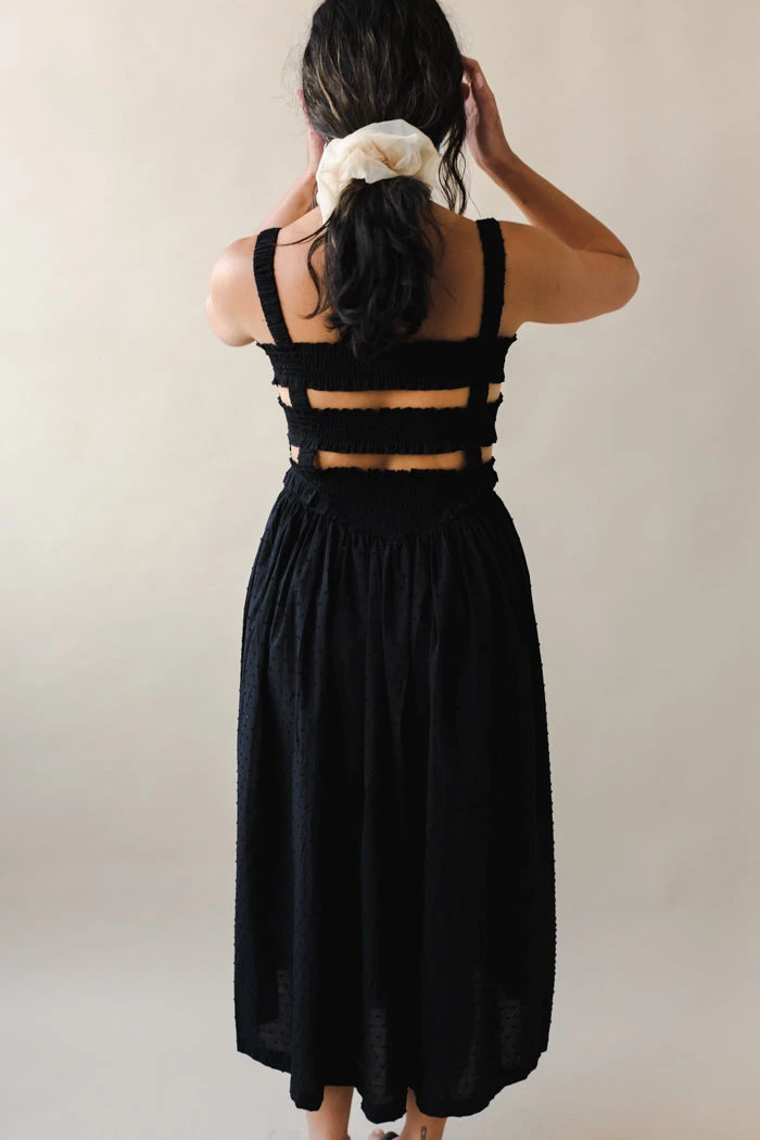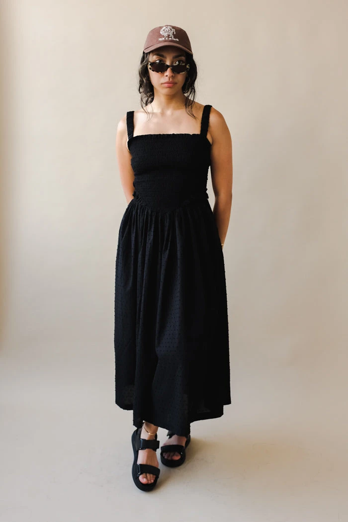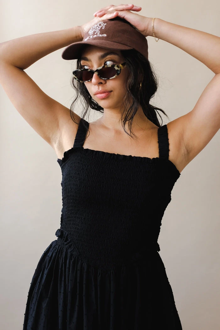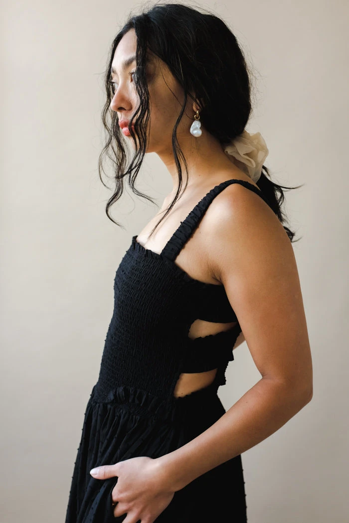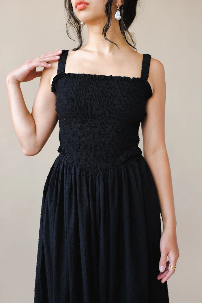 Tach black cotton voile dress, hand smocked at the top ruffled details.