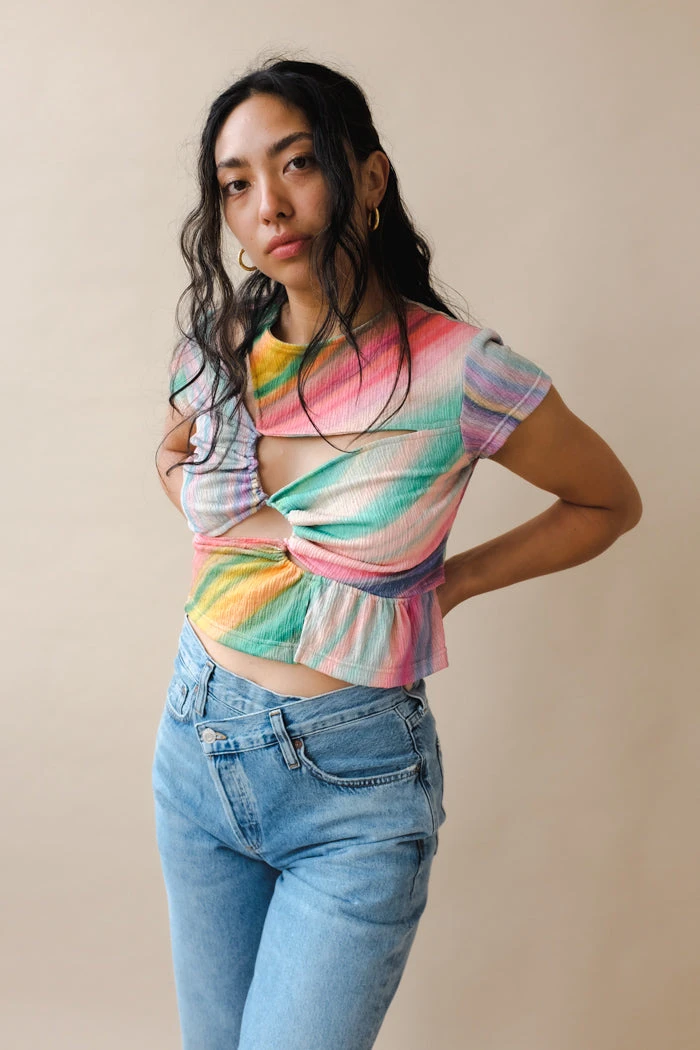 Tach Electra cut out, short sleeve, multi colored printed, textured top. Fabric is stretchy.