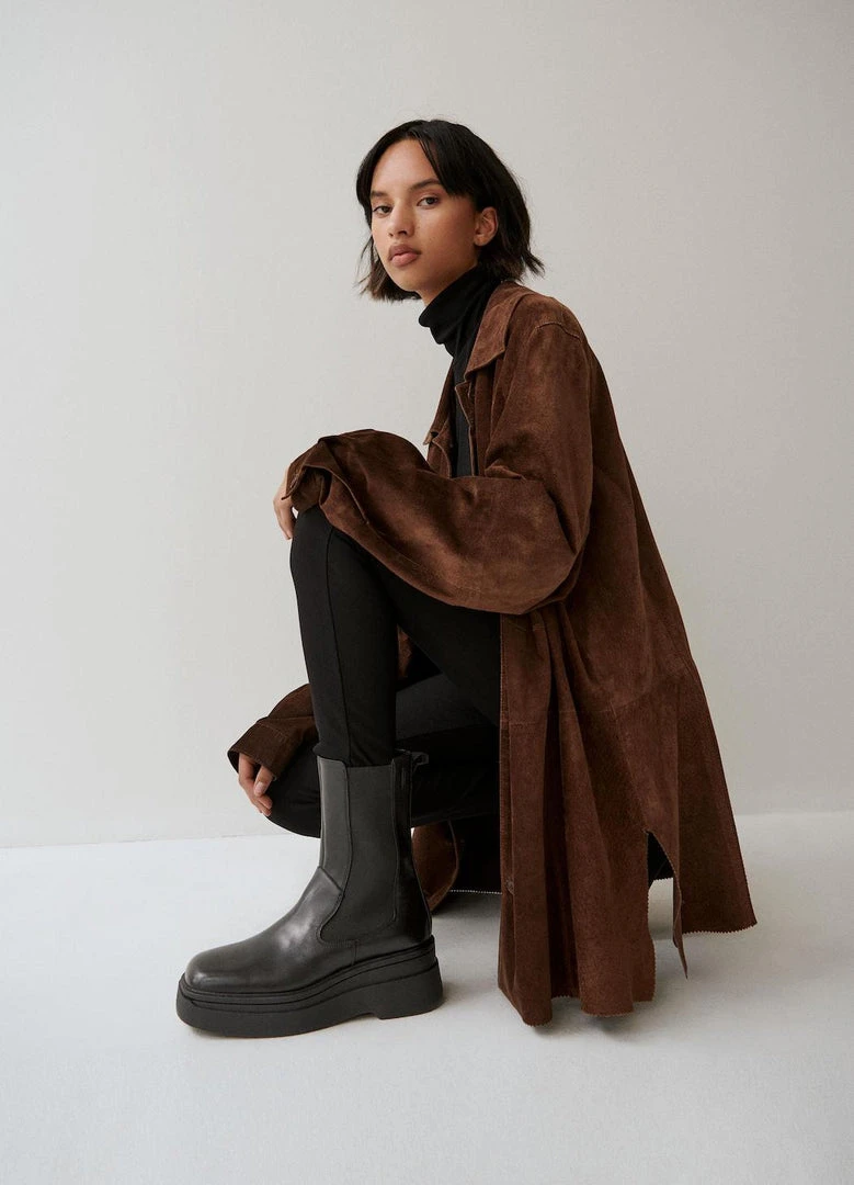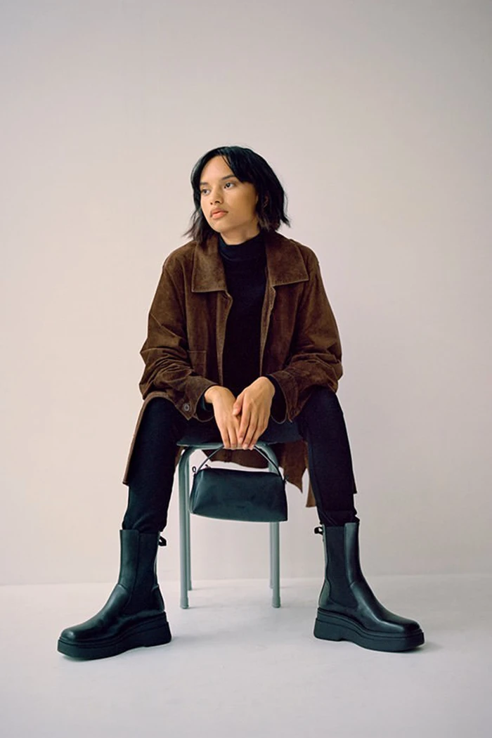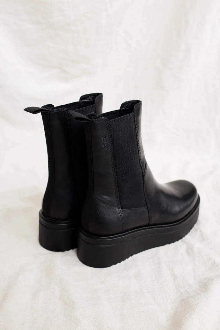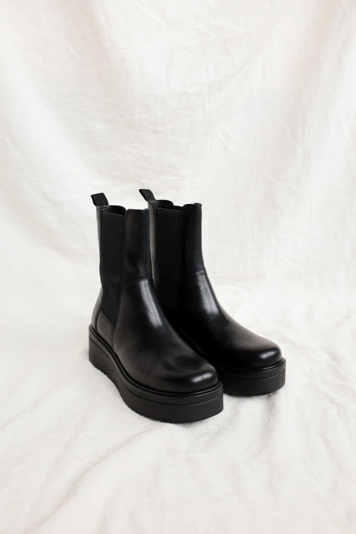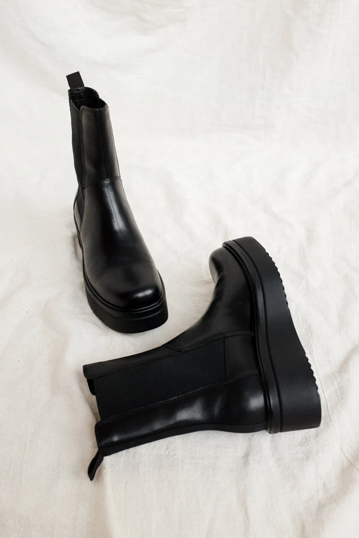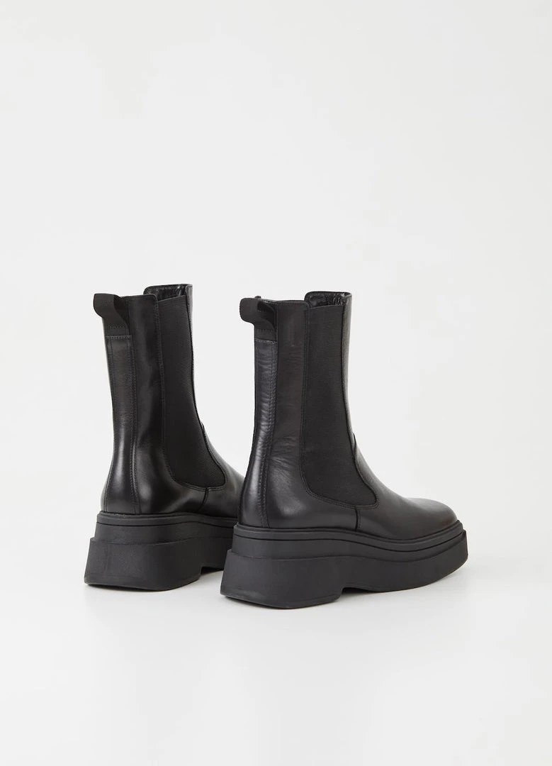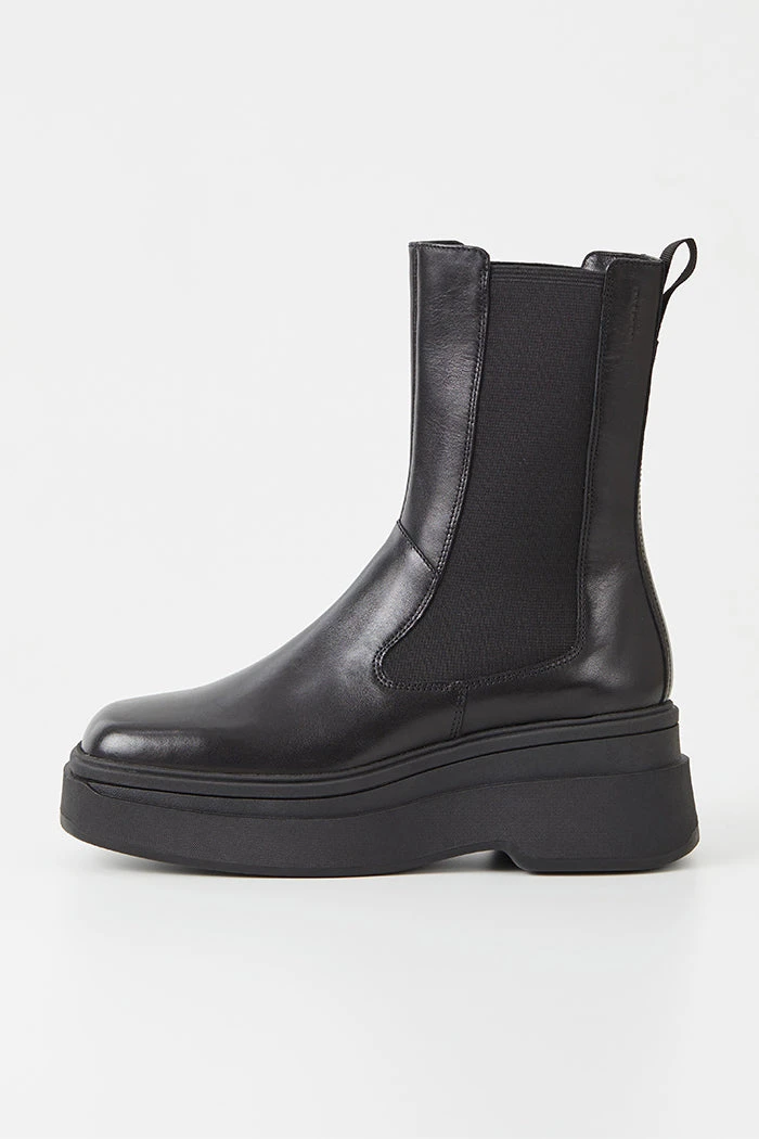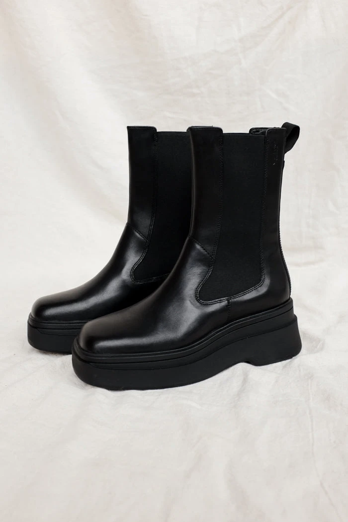 Vagabond Carla chunky, square toe, smooth black leather boot with elastic gores. These statement-making boots are designed with a mid-high shaft, and a solid sole measuring 69mm and sets out the next level of chunkiness this season.