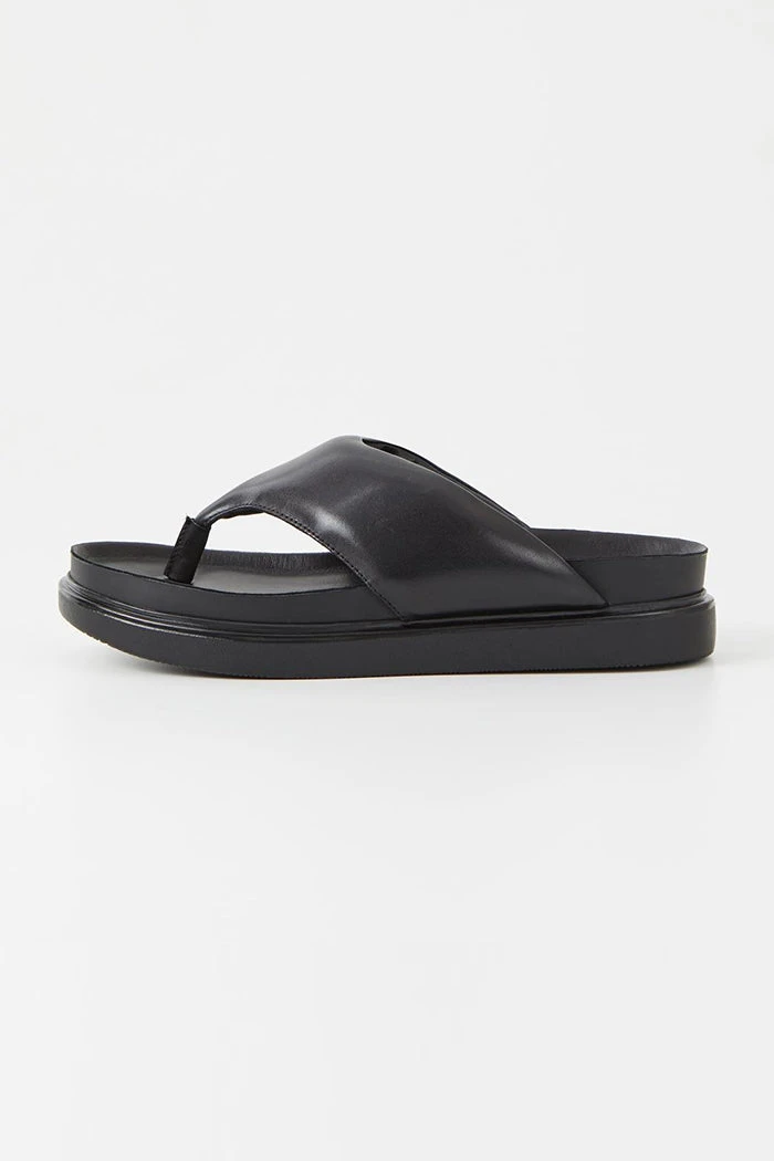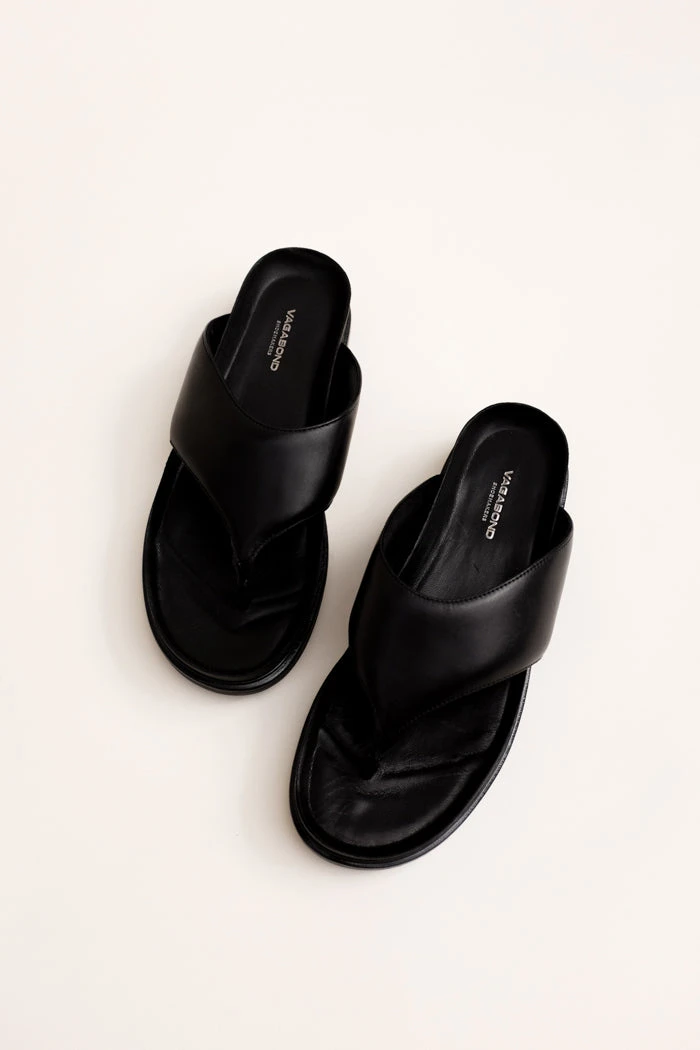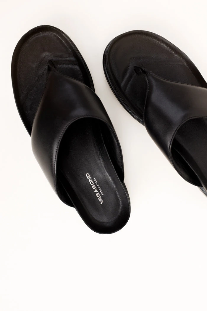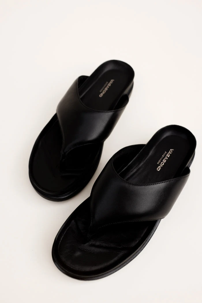 Vagabond Shoemakers Erin black leather flip flop thong sandals with platform. Minimalist thong sandals Erin is new for the season and designed with a slightly padded upper for a contemporary look. The simple toe post silhouette, made from black leather straps, is set on tonal 40 mm soles for a monochrome appearance.