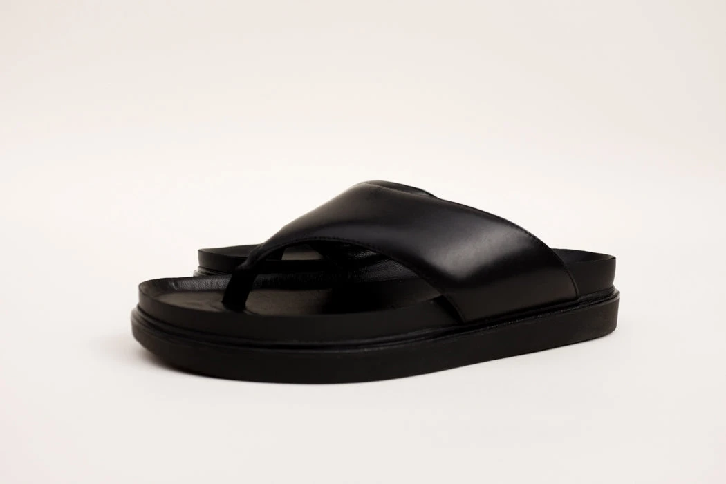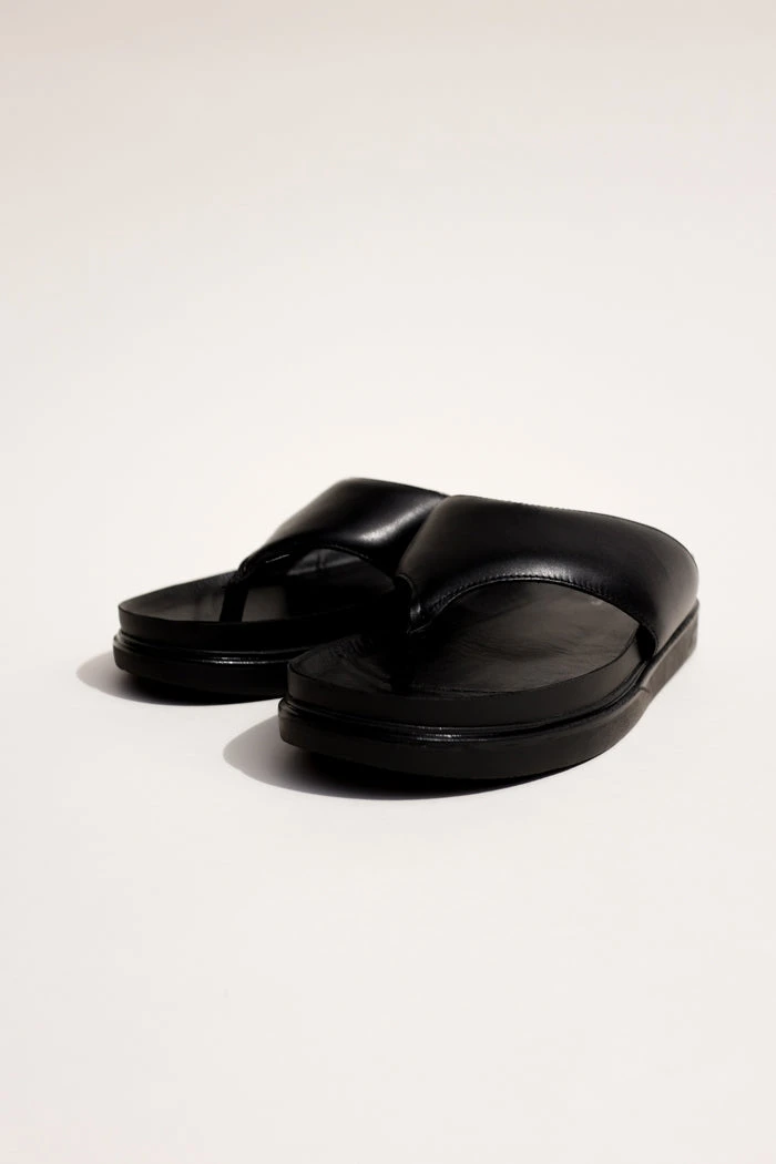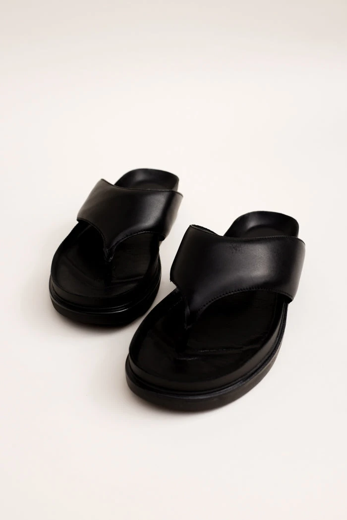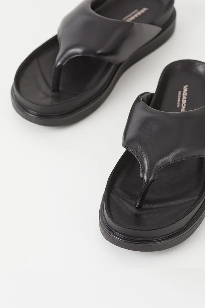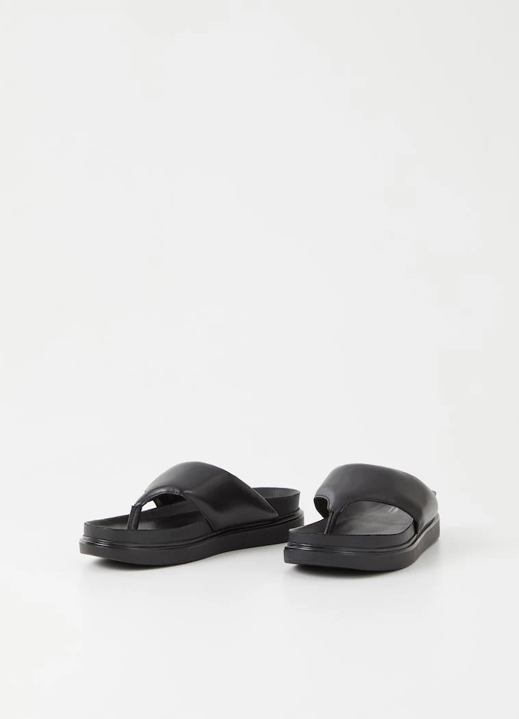 Vagabond Shoemakers Erin black leather flip flop thong sandals with platform. Minimalist thong sandals Erin is new for the season and designed with a slightly padded upper for a contemporary look. The simple toe post silhouette, made from black leather straps, is set on tonal 40 mm soles for a monochrome appearance.