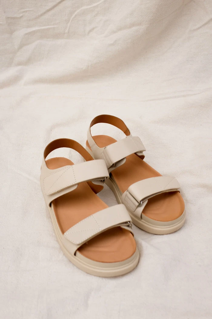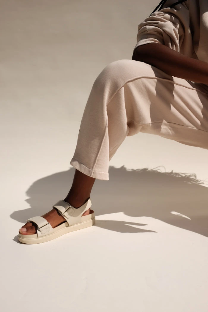 Vagabond Erin two strap leather sandal in off white . Hanging by the pool or exploring the city – new sandal Erin has endless styling possibilities. The minimalist upper with velcro straps, crafted from black leather is combined with a chunky outsole for immediate urban style impact.