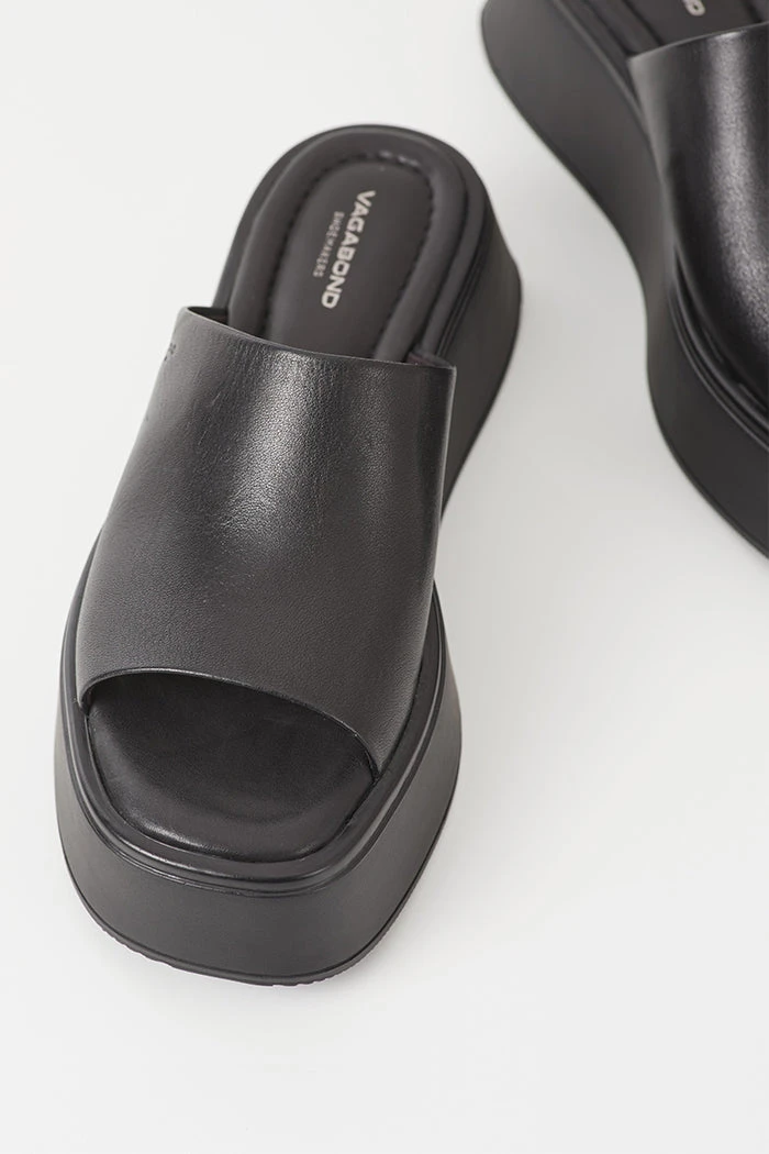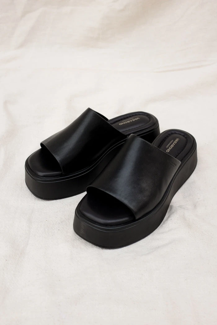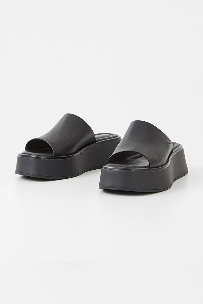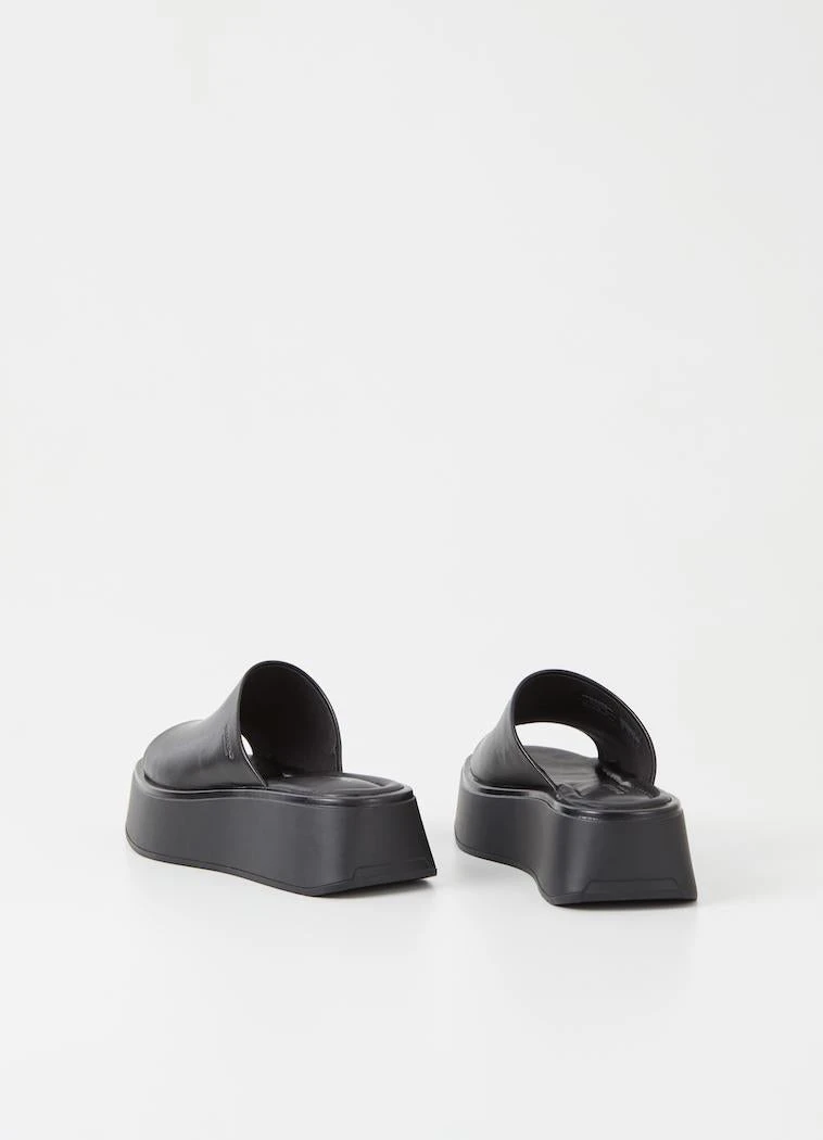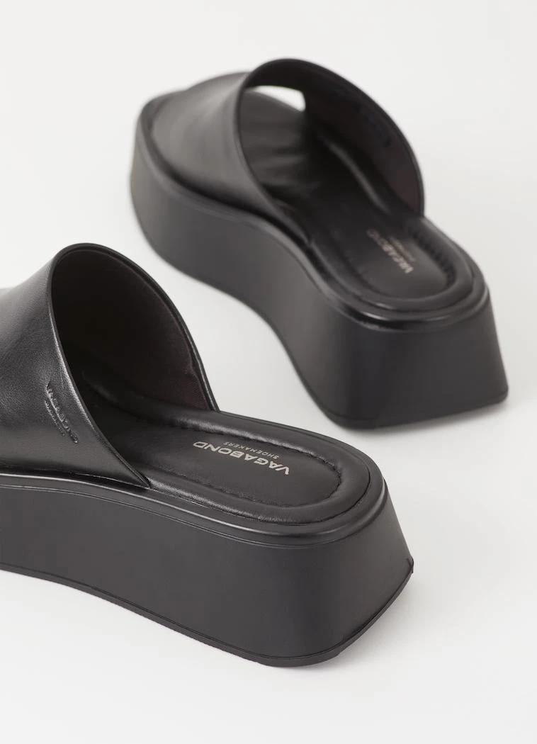 Vagabond Shoemakers Courtney platform slides. It is all about the characteristic flared outsole that makes this pool slide style the ultimate sandal of the season. The simple slip-on upper, made from black leather, is grounded by tonal flatform soles measuring 50 mm. Details include padded insoles and square toes.