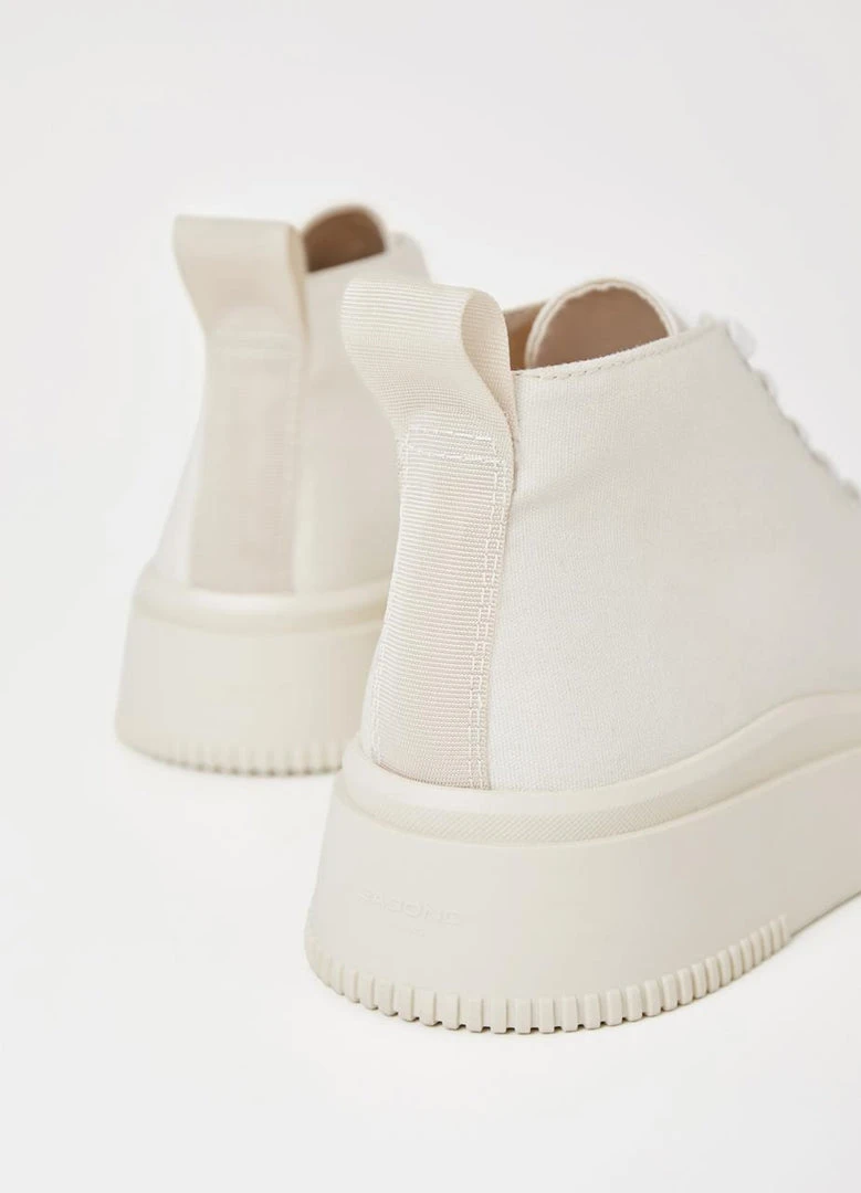 Vagabond Stacy high-top flatform sneakers with a contemporary silhouette in cream. Crafted in cream white textile featuring lace-up fastening, rounded toes and pull-on tabs.