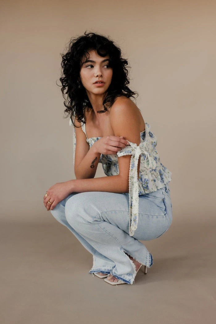 Winston White Marjorie Top in floral Pewter Petal. Features a custom print, intricate lace trim on tie straps, elastic under bust and at waist with a ruffle edge.