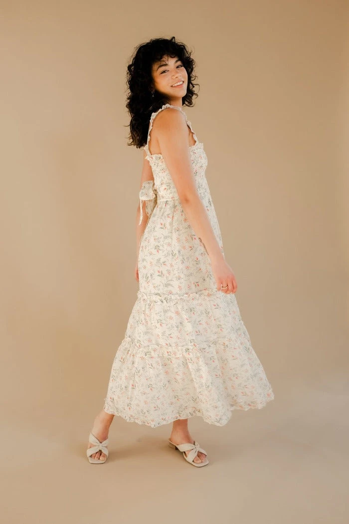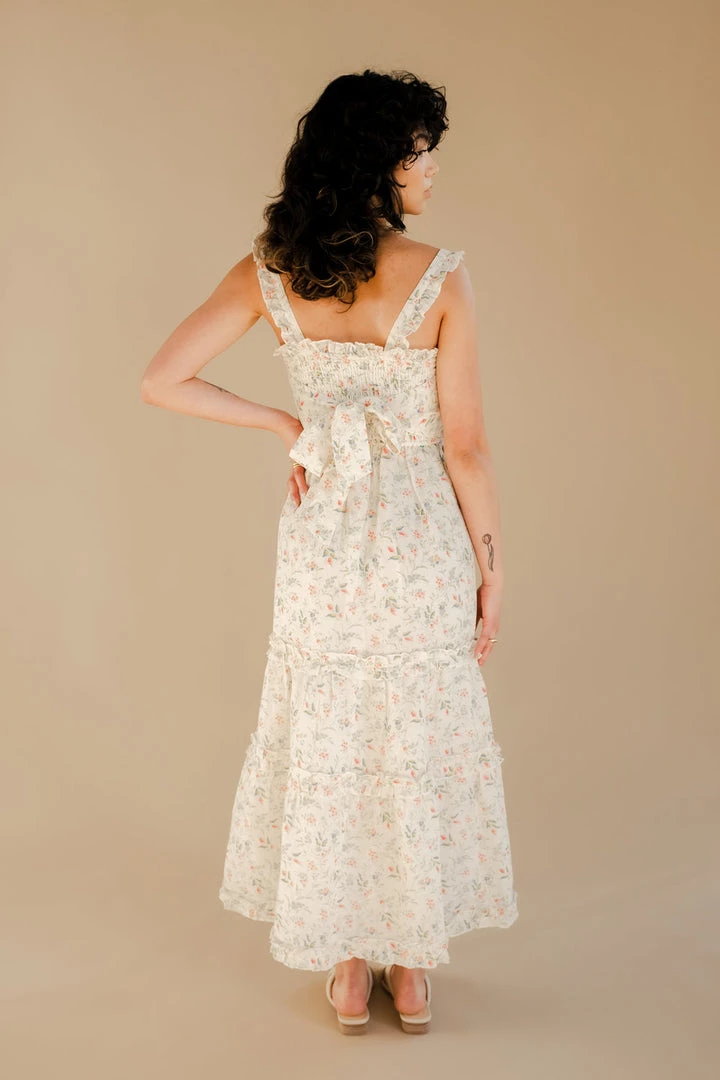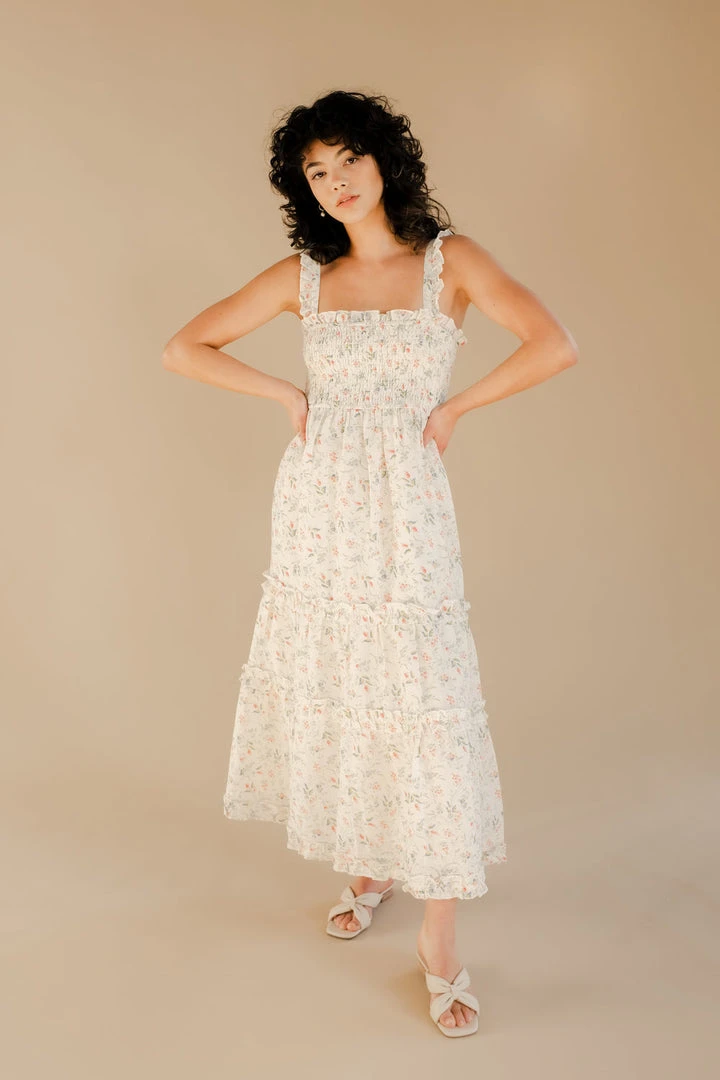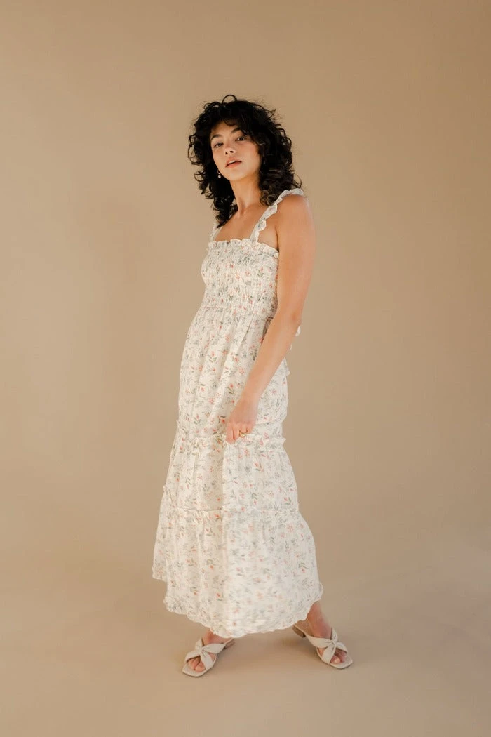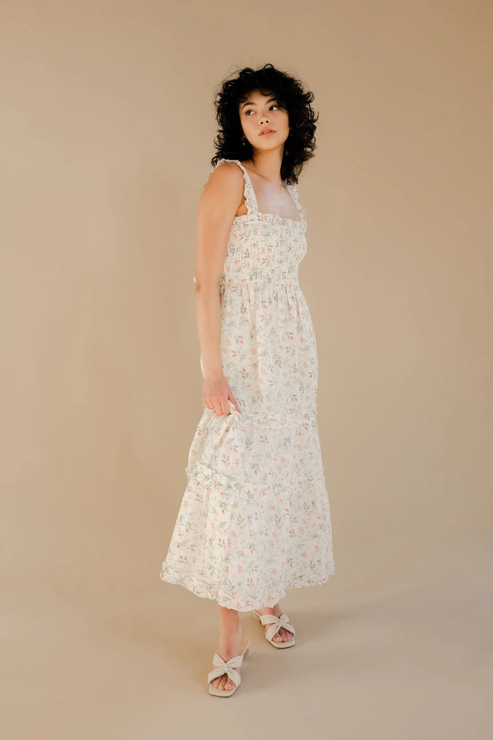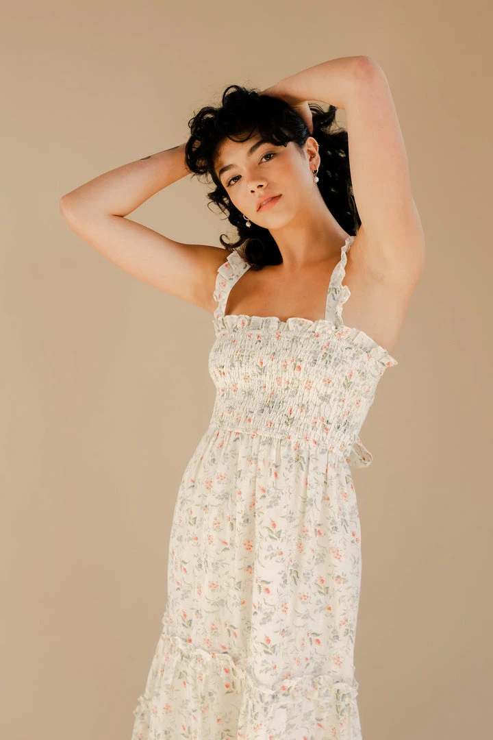 Winston White smocked long Tahoe dress in coral fleur print. Custom floral print. Features ruffle straps, smocked chest, tie back at waist, and ruffle details on ankle length skirt.