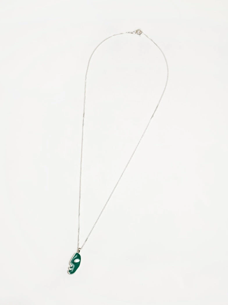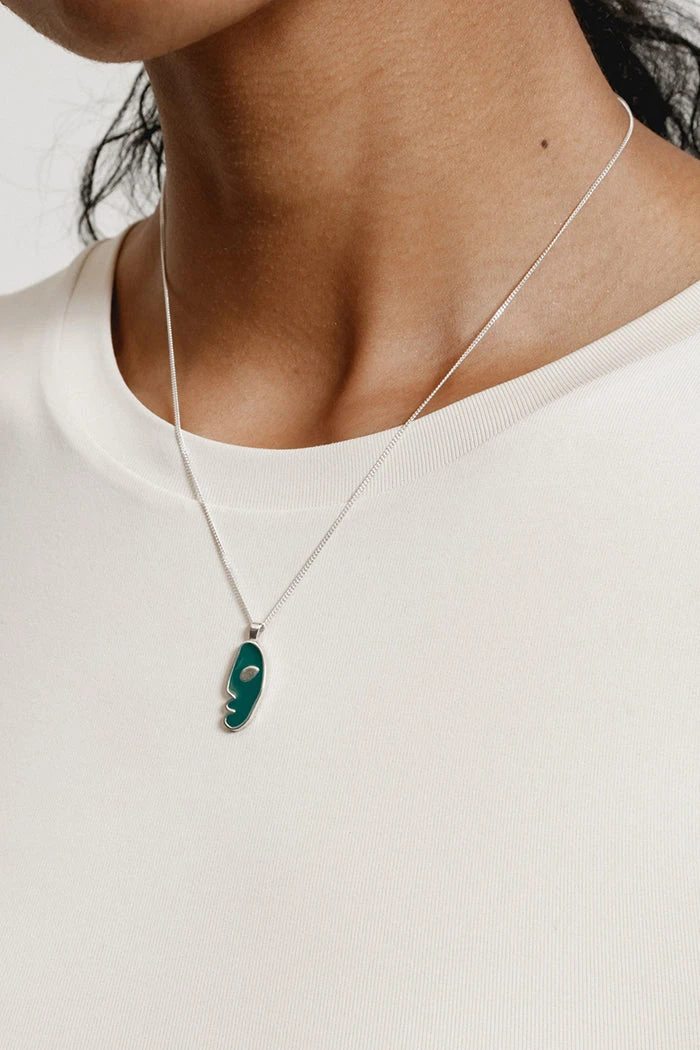 Wolf Circus Fiona face necklace in green and sterling silver. “Duality” Playing with the light and dark, contrast. One cannot exist without the other.