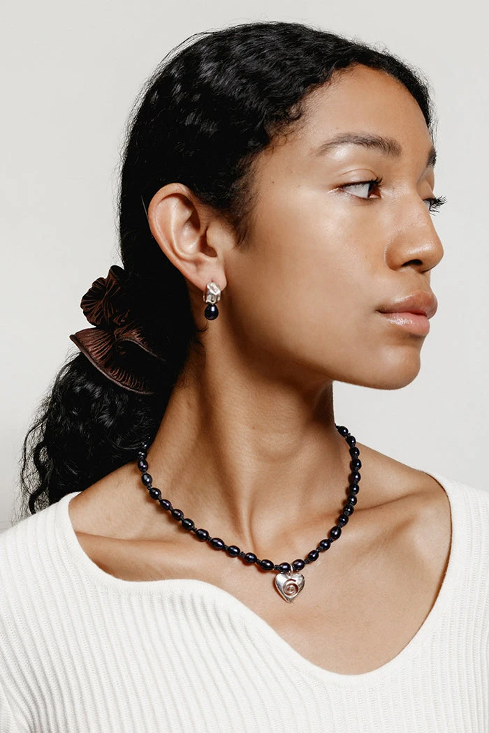 Wolf Cirucs modern Lottie organic hoop earrings in Sterling Silver with iridescent black pearls. Each one perfectly unique.