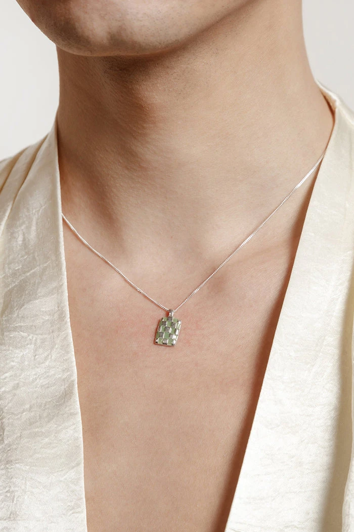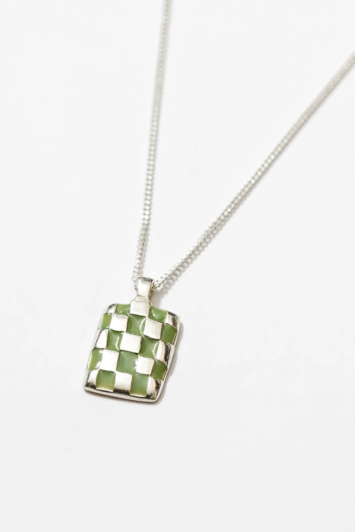 Wolf Circus silver Penny rectangular checkered pendant necklace with green resin.