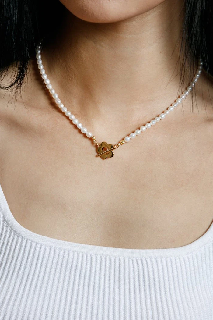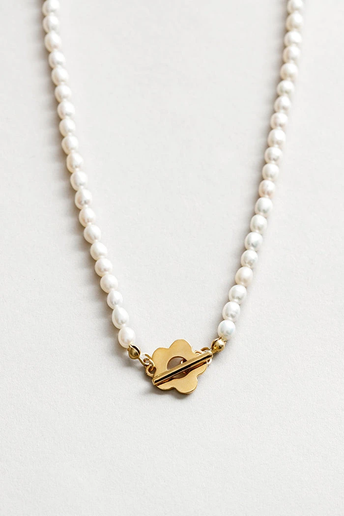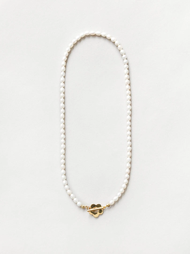 16.5” freshwater pearl necklace with either a 14k gold-plated bronze or solid sterling silver toggle clasp.